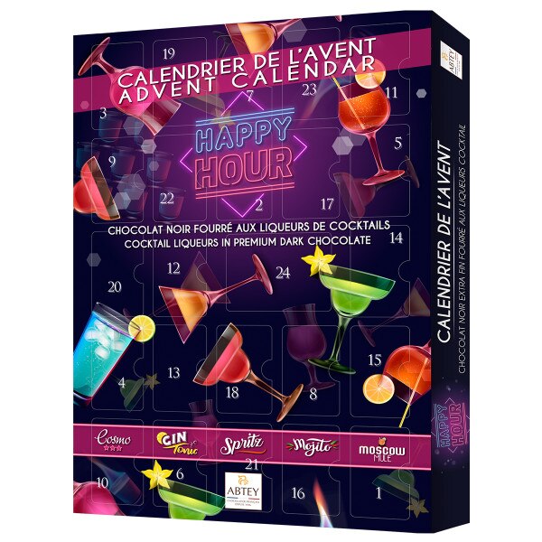 INGREDIENTS: Cacao : 51% minimum dans le chocolat / invert sugar syrup, sugar, cocoa paste, cocoa butter, alcohol, Vodka (1.47%), white Rum (1.03%), Gin (0.86%), emulsifier: soya lecithin, Cointreau® (0.39%), flavours, vanilla extract. Cocoa min in chocolate: 51%