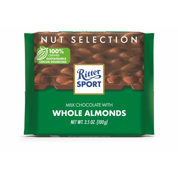 Ritter Sport® Milk Chocolate with Whole Almonds Bar(0)No Reviews yet Please log in to see price or purchase this item Quantity discounts available QuantityPrice ITEM: 24882 PACK SIZE: 11/3.5 OZ BRAND HERITAGE: Germany UPC: 050255023002 SHIPPING AND STORAGE: Sensitive to Heat/Cold - this item requires Storage between 60-65F (+16C) DIETARY RESTRICTIONS: Natural Details Ritter Sport® Milk Chocolate with Whole Almonds Bar During warm weather, this item ships via temperature-controlled truck or expedited shipping. See T... Details Back DetailsRitter Sport® Milk Chocolate with Whole Almonds BarDuring warm weather, this item ships via temperature-controlled truck or expedited shipping. See Terms & Conditions for details about our PERISHABLES & WARM WEATHER SHIPPING policy. Reviews 0 Back Ratings & ReviewsNo reviews availableBe the first to Write a Review